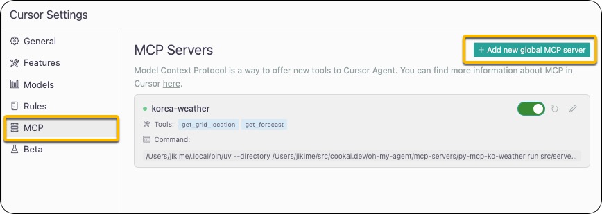 아래 스크린숏은 실제로 MCP 서버(korea-weather)를 등록한 예시입니다.