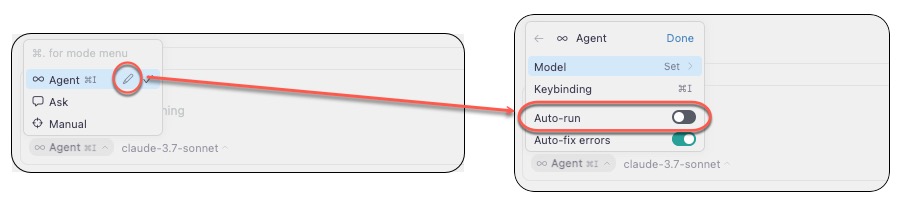 - 자동 실행 모드 (Auto-run): 승인 없이 자동으로 실행되도록 설정할 수 있습니다. 이를 통해 Agent는 마치 터미널 명령을 실행하듯 도구를 사용할 수 있습니다.