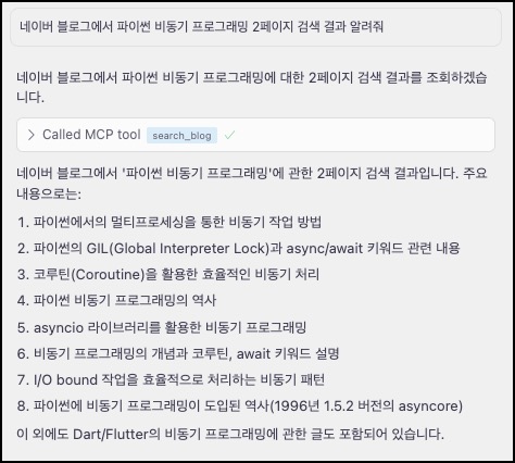 이제 Cursor의 AI 채팅 기능(CMD + L)에서 네이버 검색 관련 자연어 요청을 할 수 있습니다. 예를 들어, "네이버 블로그에서 파이썬 비동기 프로그래밍 2페이지 검색 결과 알려줘"와 같이 요청하면, Cursor AI는 등록된 MCP 서버의