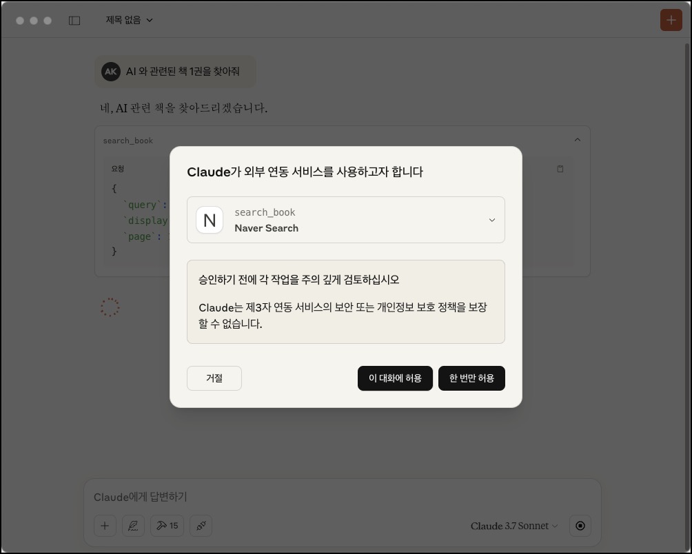 • MCP 서버의 도구를 처음 호출할 때, Claude Desktop은 사용자에게 도구 사용 허가를 요청하는 팝업을 표시합니다.
