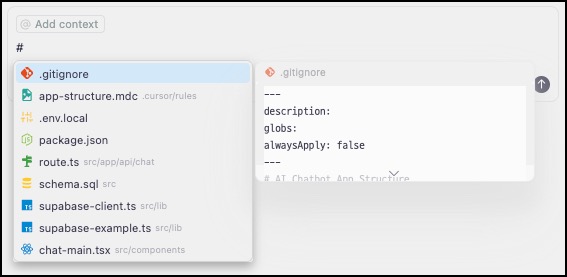 - @Past Chats: 복잡한 작업 시 이전 대화의 콘텍스트나 결정을 참조하기 위해 이전 채팅의 요약 버전을 콘텍스트로 포함할 수 있습니다.