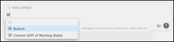 - @Git: Git 커밋, diff 또는 풀 리퀘스트를 프롬프트에 추가합니다 (Chat 전용). diff를 스캔하여 버그나 문제를 찾거나, 현재 diff(@Diff of Working State)를 사용하여 커밋 메시지를 생성하는 데 사용할 수 있습니다.