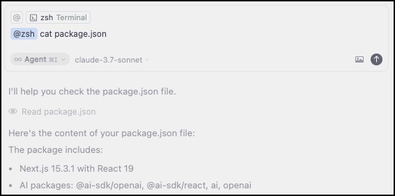 - @Terminal: shell(zsh)를 콘텍스트로 참조하고 실행할 수 있습니다.