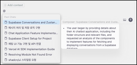 - @Past Chats: 복잡한 작업 시 이전 대화의 콘텍스트나 결정을 참조하기 위해 이전 채팅의 요약 버전을 콘텍스트로 포함할 수 있습니다.