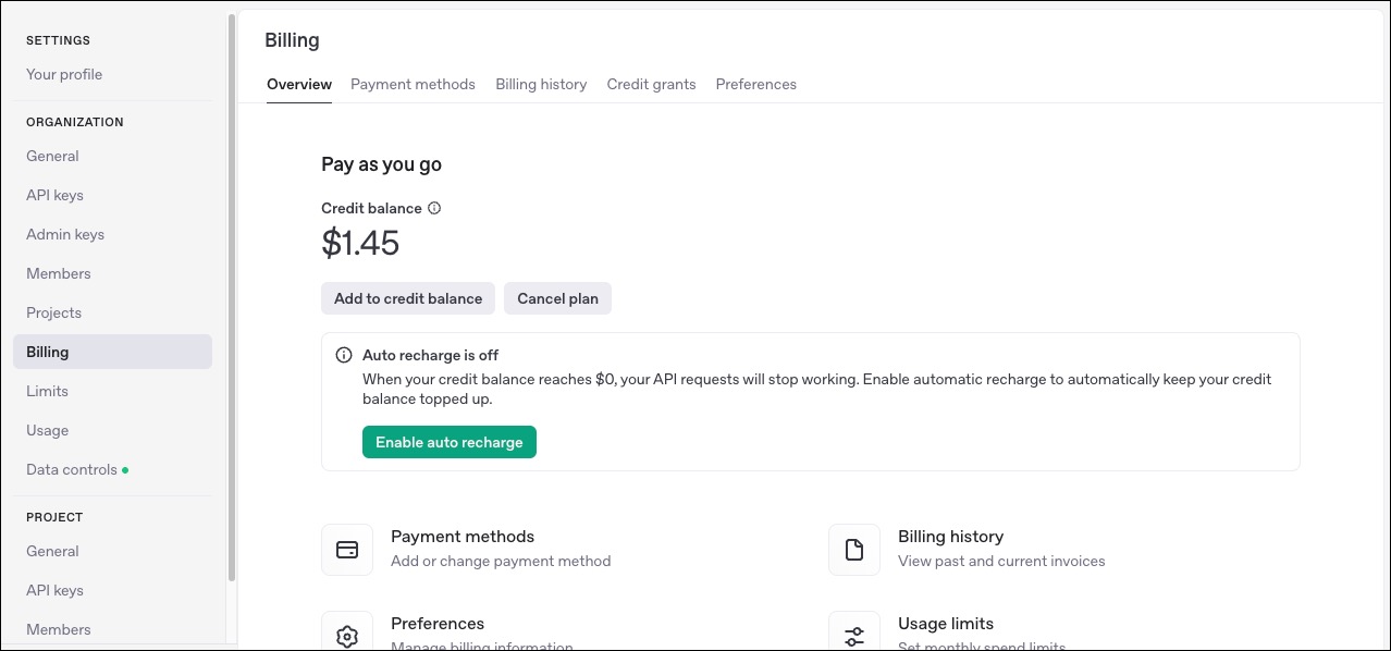 OpenAI 계정에 결제 수단을 등록하고 나면, 계정 설정의 'Billing' 메뉴에서 API 사용량과 관련된 비용을 관리할 수 있습니다. 아래 이미지와 유사한 화면을 보게 될 텐데요, 몇 가지 주요 항목을 알아두면 좋습니다.