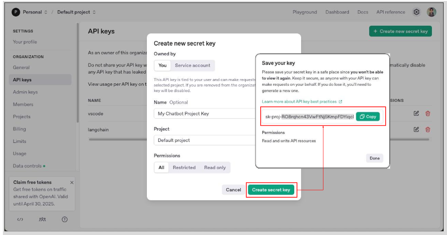 단계 05 Key의 용도를 알아보기 쉽도록 이름을 지어줍니다 (예: 'My Chatbot Project Key').