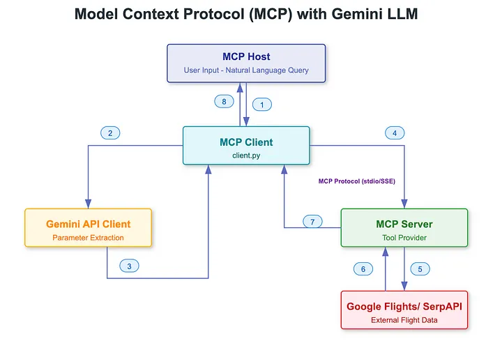 아래 프로젝트는 Gemini와 MCP를 사용하여 자연어 항공편 검색을 가능하게 하는 여러 구성 요소를 통합합니다.