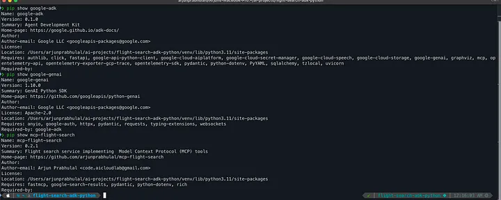 google-adk: 에이전트 구축을 위한 Google의 에이전트 개발 키트입니다.google-genai: Generative AI 모델(예: Gemini)과 상호작용하기 위한 Google 라이브러리입니다.mcp-flight-search: MCP 라이브러리를 사용하여 SerpAPI를 통해 항공편을 검색하는 MCP 서버입니다.