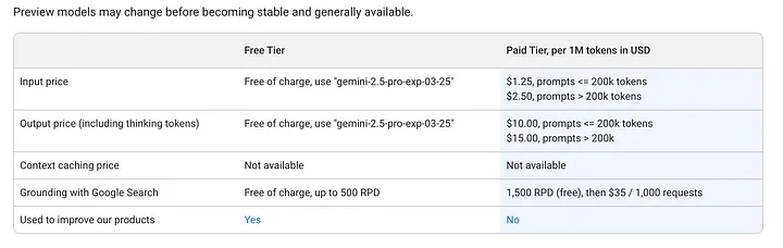 Gemini 2.5 Pro Preview — Google 문서에 따르면, Gemini API "무료 등급"은 테스트 목적으로 더 낮은 비율 제한으로 API 서비스를 통해 제공됩니다. Gemini API "유료 등급"은 더 높은 비율 제한, 추가 기능 및 다른 데이터 처리 방식을 제공합니다.