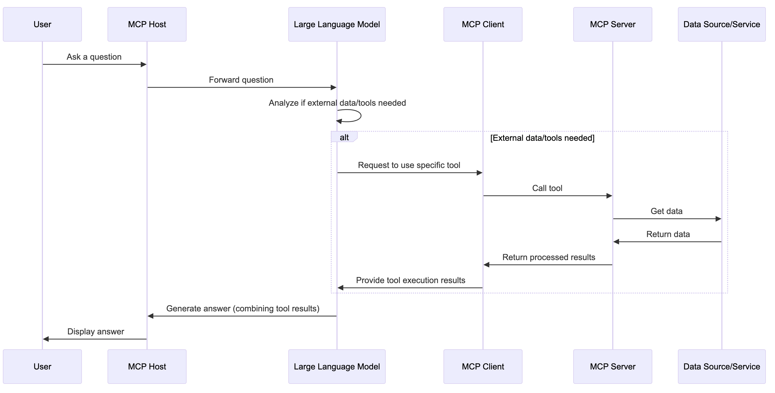 Model Context Protocol (MCP)의 도구 요청 플로우는 MCP 호스트(예: Claude Desktop, Cursor)와 클라이언트가 MCP 서버와 상호작용하여 도구를 호출하는 과정을 포함합니다.아래는 전체 플로우를 단계별로 설명한 내용입니다. 이 설명은 MCP의 클라이언트-서버 아키텍처와 표준화된 통신 방식을 기반으로 하며, Anthropic의 MCP 문서와 관련 정보를 참조하여 작성되었습니다.MCP 도구 요청 플로우MCP는 호스트(사용자가 직접 상호작용하는 애플리케이션), 클라이언트(호스트 내에서 서버와 1:1 연결을 관리), 서버(도구, 리소스, 프롬프트를 제공)로 구성됩니다. 도구 요청 플로우는 다음과 같은 단계로 진행됩니다:초기화 (Initialization)호스트 시작: 사용자..